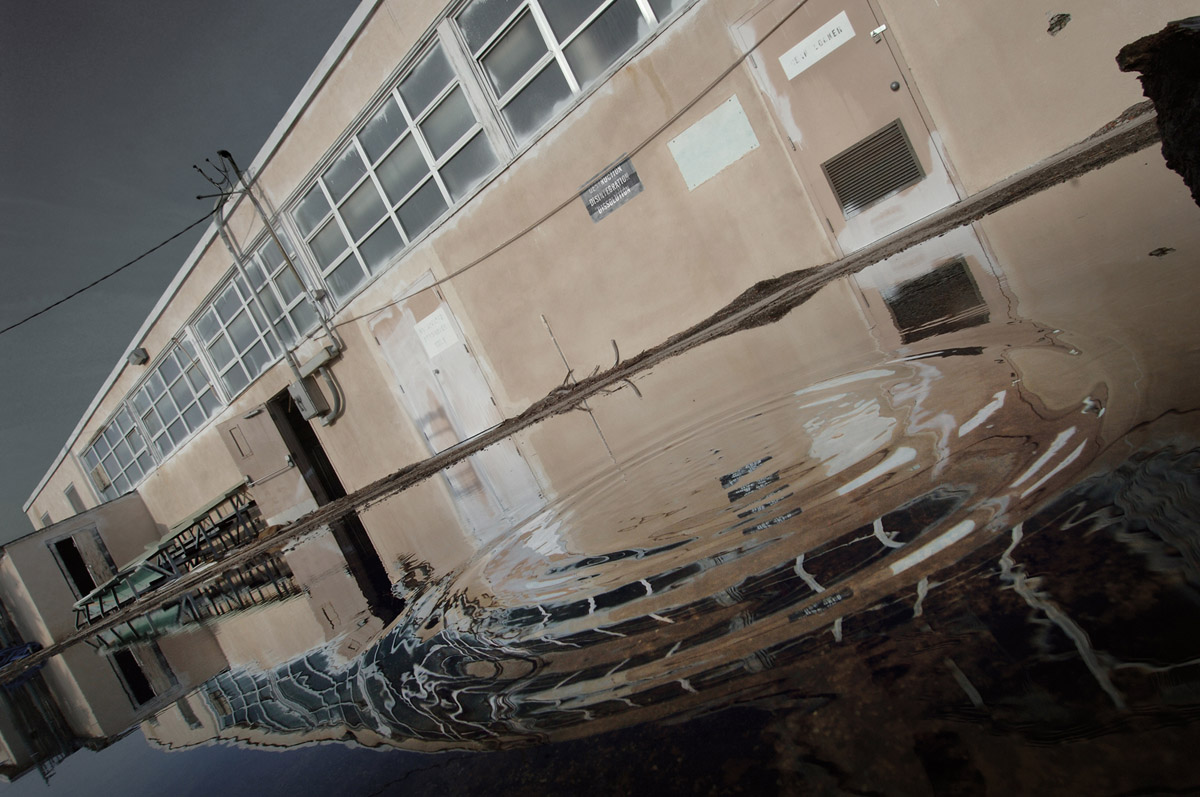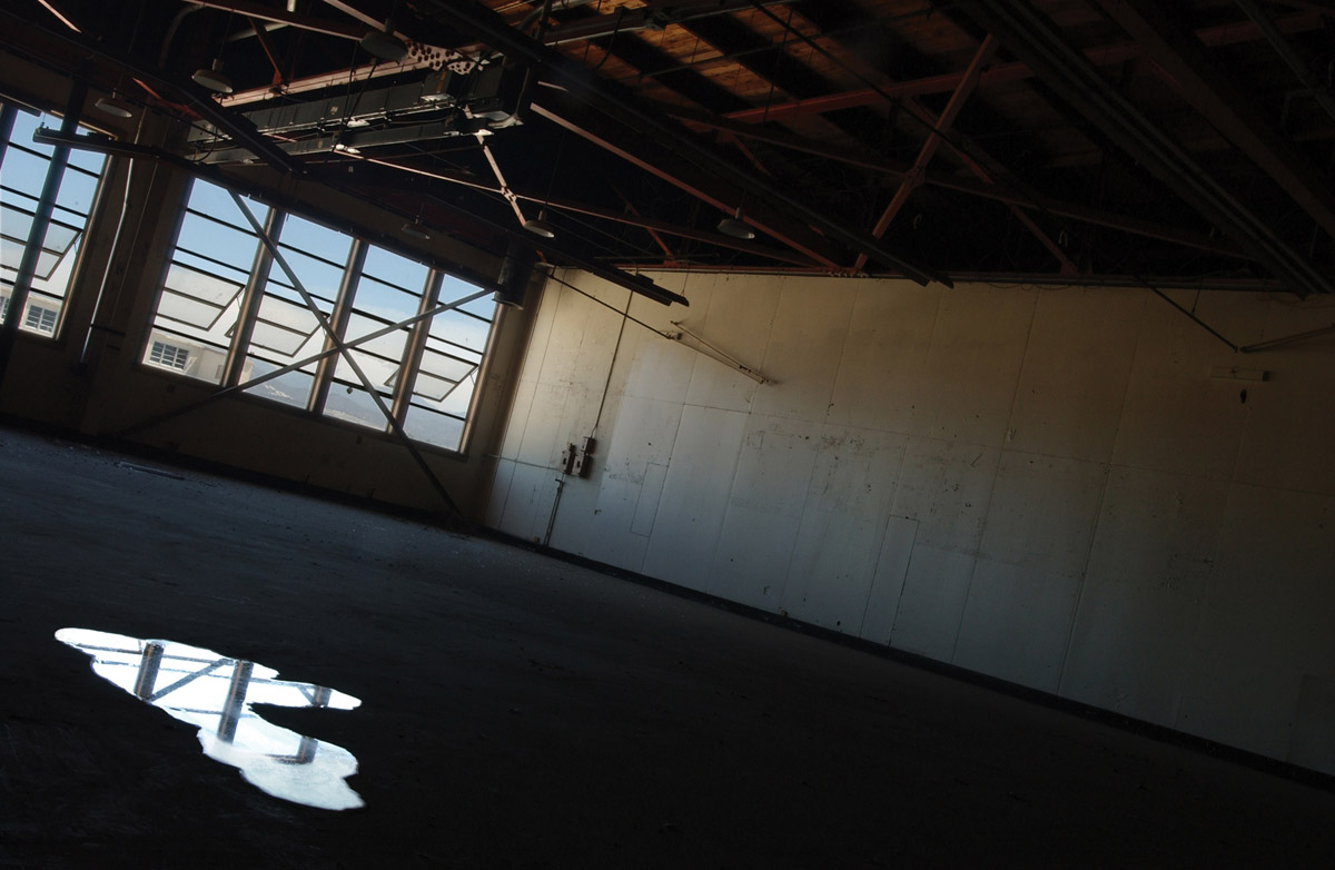 I poured one liter of purified water onto the dust-covered floor of an upper room. I lay prone in the dirt with my camera and watched the water slowly flow. When I stood and gathered my things, I disturbed a pair of white owls who flew off through the tangles of trusses and razor wire.