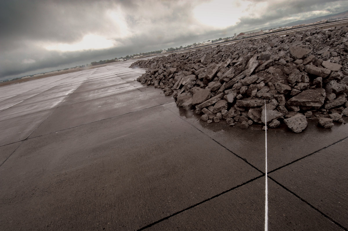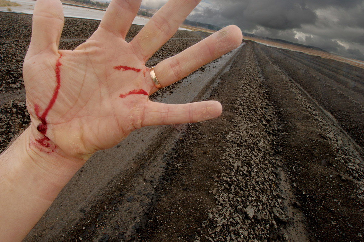I didn't have it planned, but it was perfect. At the Museum of Contemporary Art the day before, I had watched the 34 second video "Fall 1"—Dutch artist Bas Jan Ader falling from a Los Angeles roof in 1970. And then, of course, I had Matthew Goniwe's story running in my head. So, I was not too surprised when a steep slope of broken runway concrete shifted and a chunk crushed my left hand. I got out my camera and made an image.