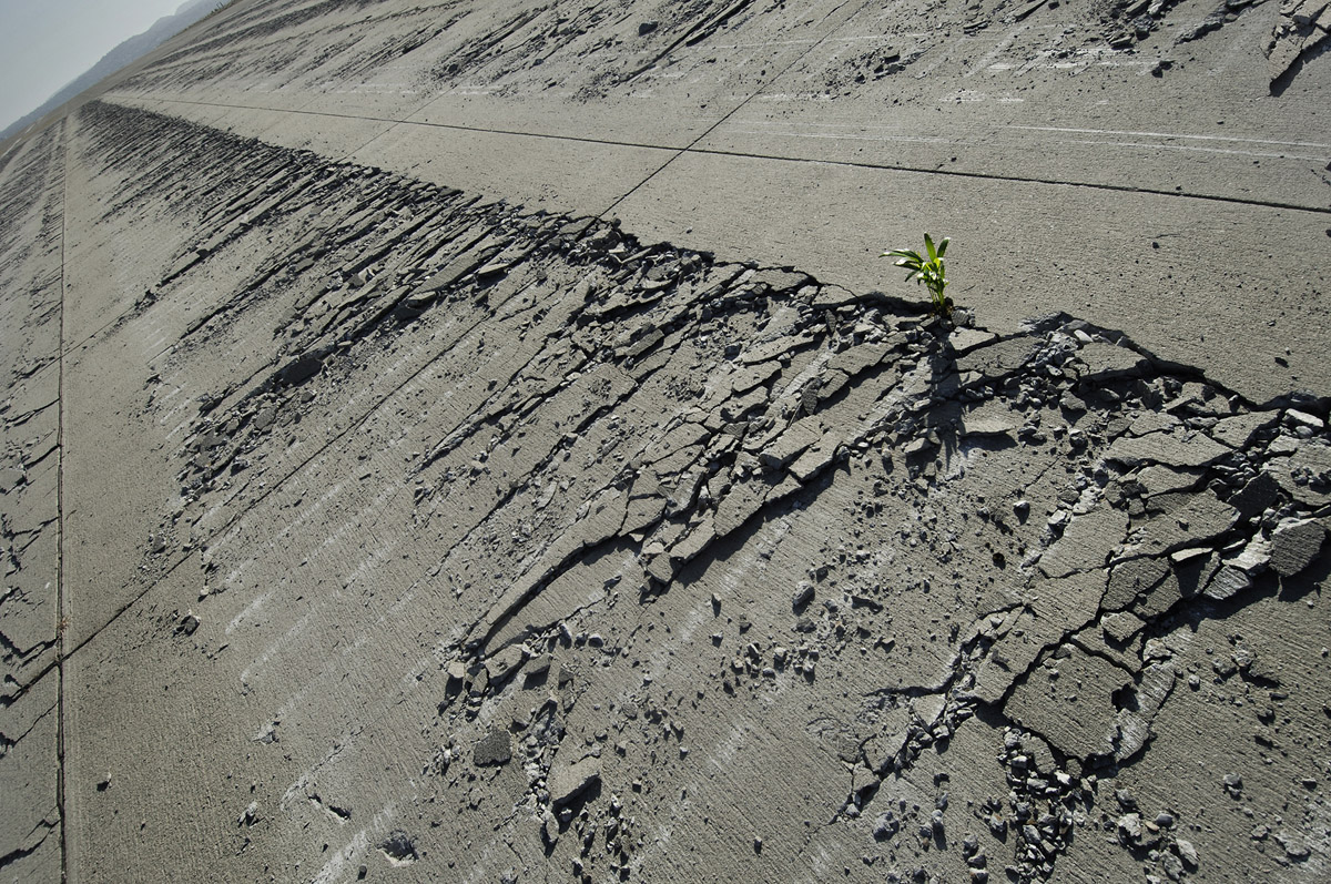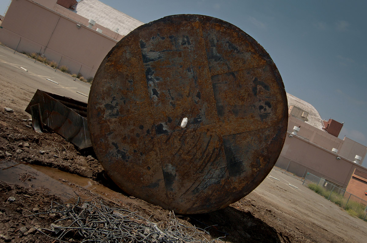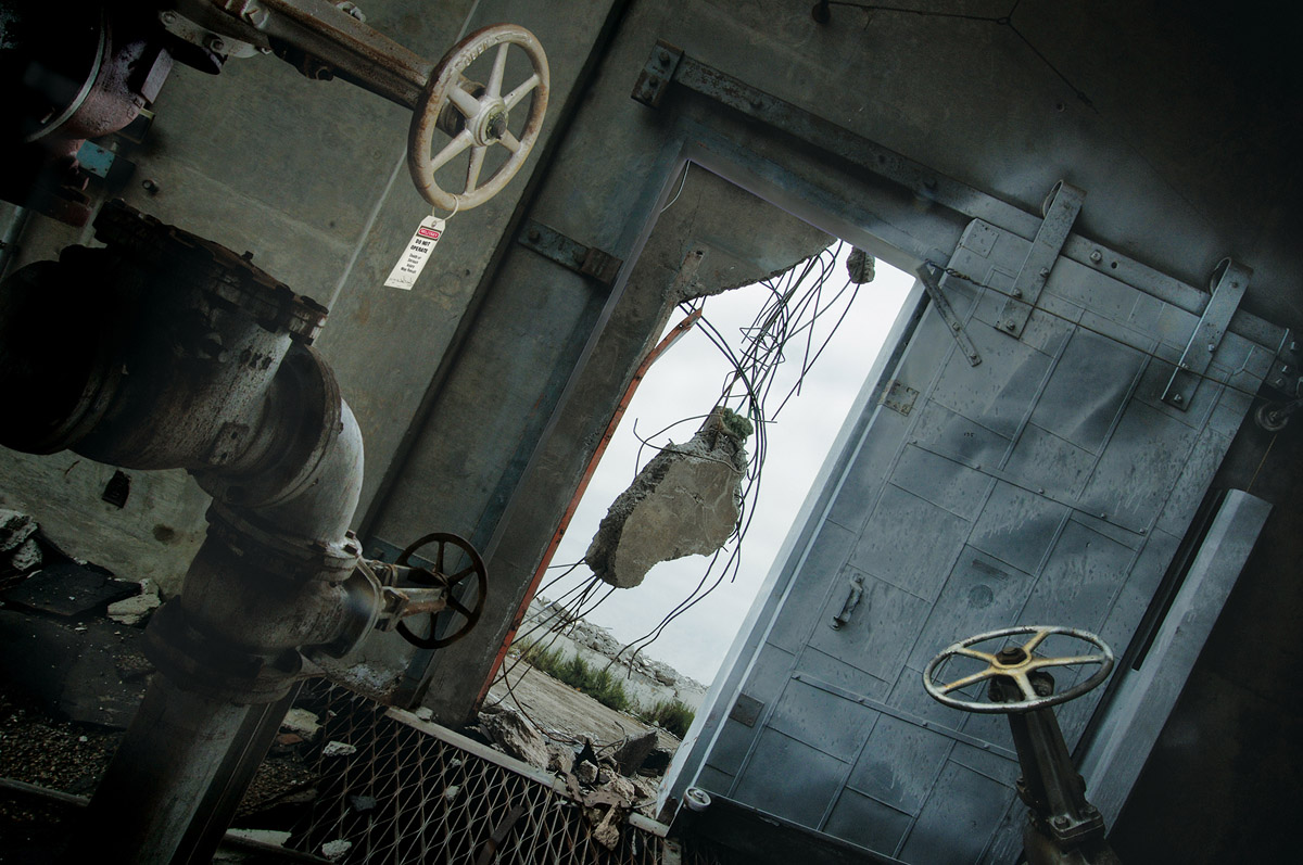 Machines had been tearing at the outside walls. The pump room was barely passable. Just outside, a chunk of concrete the size of a child was suspended by a tangle of rebar. I reached though the door, put my right palm against a crushed edge, and pushed firmly. The concrete swung for a brief moment, then was still. When I returned twelve days later, the entire building was gone.