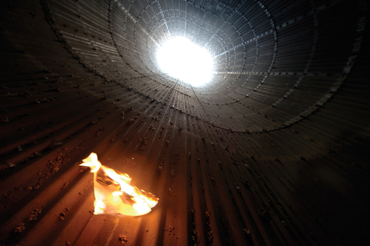 The deepest room of jet engine test building is carpeted with tiny bones. For years, raptors have killed small animals and dropped their remains down the four-story concrete chimney. In the near darkness, I selected one tiny, perfect skull. I placed it on the high concrete wall along the north wide of the test building and waited for sunset.