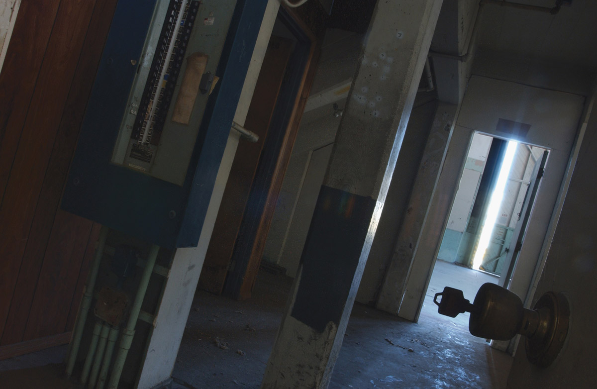 In a darkened labyrinth of military offices, there was a particular door with its key still in place. I had seen it months ago. I returned and wandered two floors of silent hallways, abandoned rooms, and door after empty door. When I finally found the door with the key, I knelt in the finely sifted dust, touched the key once, and framed a photograph toward the light.