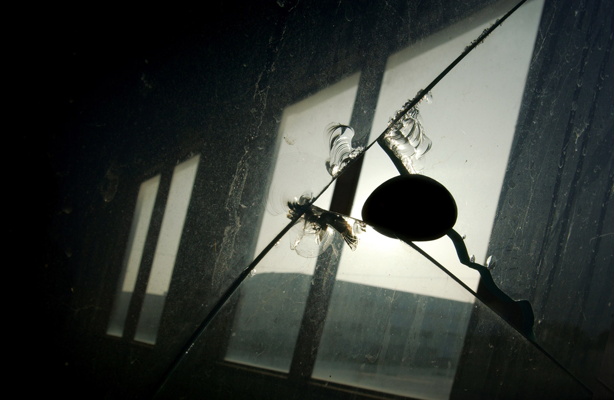 I sifted through a drift of shattered glass near a pile of forty-two uprooted steel fence posts. I wanted to find the fragments of glass from the center point, the spot where the blow had shattered the pane. By day’s end, with the sun descending into cold clouds and mist, I had only found nine pieces from the center. I assembled them atop a seven-foot cube of solid concrete—a barrier, perhaps, or a counterweight.