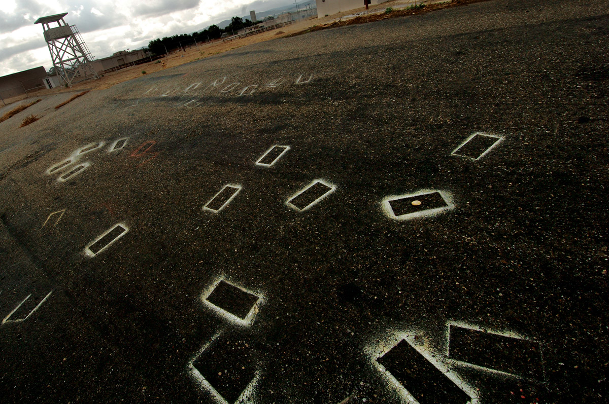 An unknown soldier had painted scores of rectangular objects near the old guard towers. I had been by the spot many times. The scatter of overspray looked like little coffins. A storm had set in and the asphalt was wet and black. I picked a worn stone and set it inside a ghost shape.