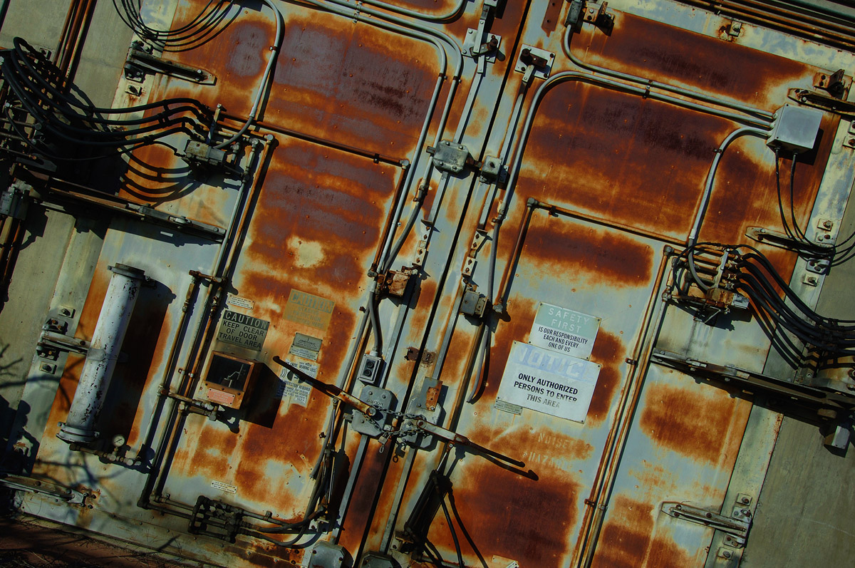 I carry keys that will open almost any building at Marine Corps Air Station El Toro. I tried all my keys twice, but none would open the padlock on the control vault. In Photoshop, I modified the photograph: not the padlock, not even the image of the padlock, but the image of the shadow of the padlock. In the shadow world, the lock hangs wide open.