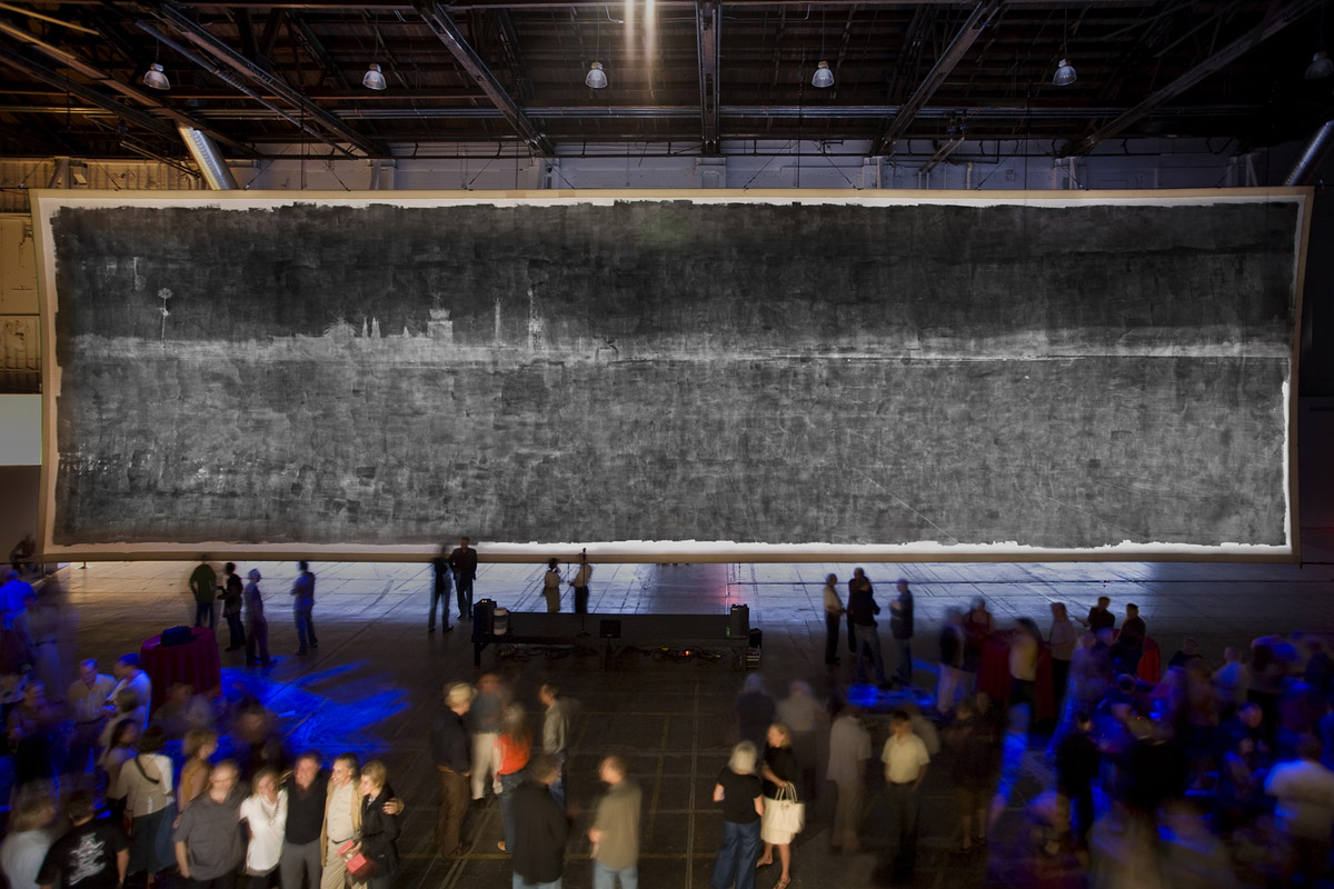 The world record photograph—32 feet by 111 feet—in place in the shuttered F-18 jet hanger transformed into the world's largest camera to make the image.