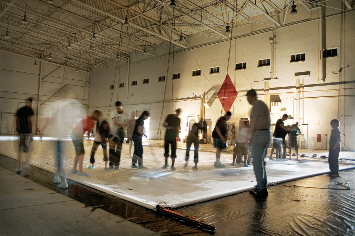 Working in a military jet-hangar-as-camera, the group hand-applied 80 liters of gelatin silver halide emulsion to a seamless 3,375-square-foot canvas substrate custom-made in Germany for the project. Development required a custom Olympic pool-sized developing tray, ten high-volume submersible pumps, and 1,800 gallons of black and white chemistry. The Great Picture was completed in July 2006.