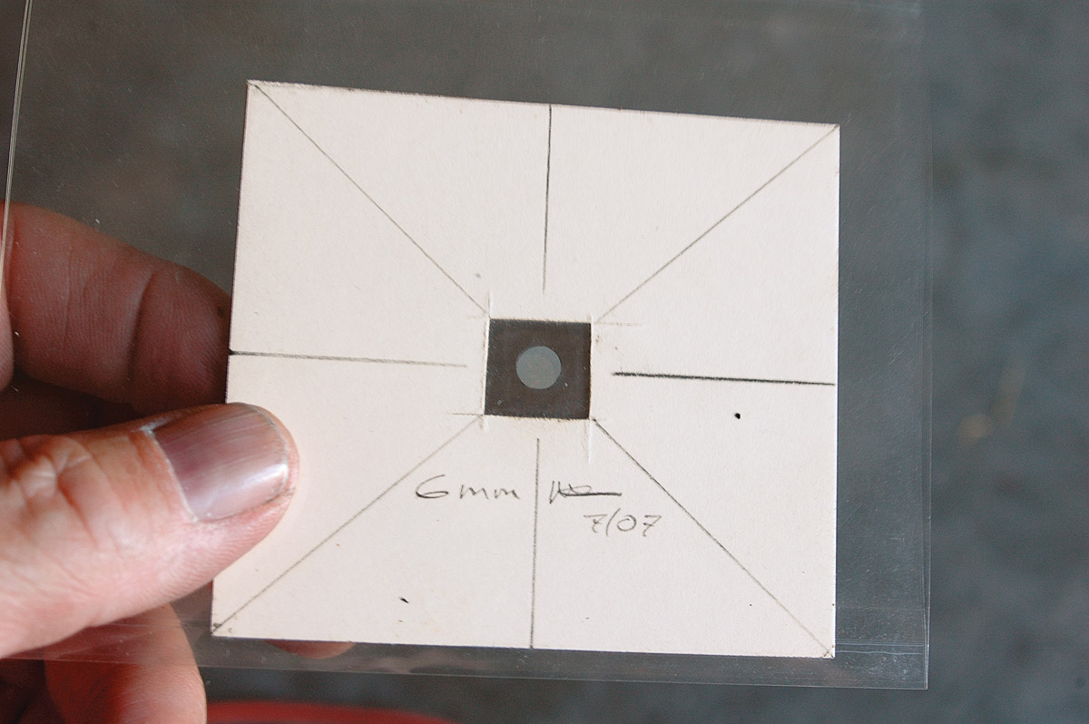 After extensive calculations, conjecture, and testing, a camera obscura aperture of 6mm was selected, the final aperture milled from extremely thin titanium sheet.