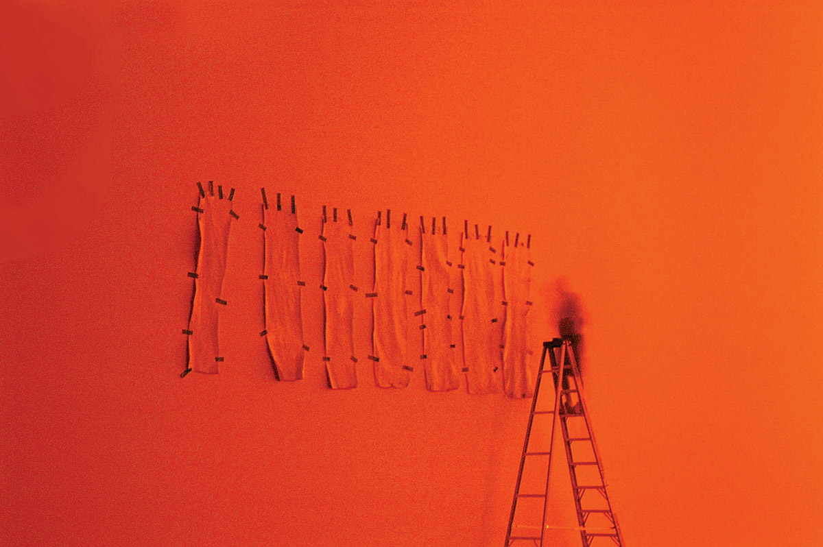 The first row of test strips being hung on the canvas surface from the precarious top of an 18-foot ladder.